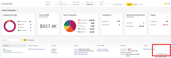 Navigate to the member account using any of the search or filter features. Select Detailed View to navigate to the Company's Dashboard.