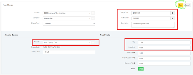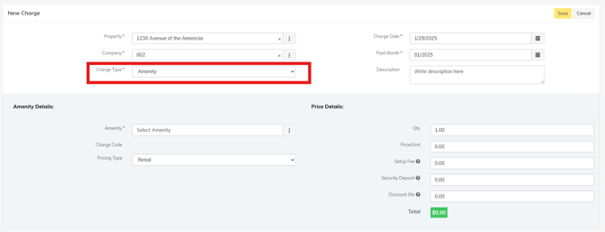 Select the Charge Type - Menu includes: Amenities, Credit, Security Deposit, or Custom.