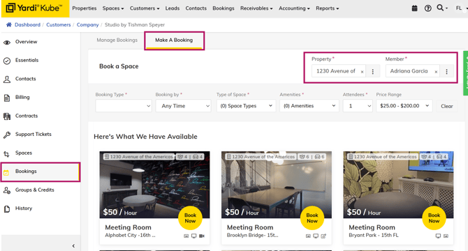 Step 2: Create a booking by going to the "Bookings" tab on the left side menu. Make sure your information is selected correctly under "Property" and "Member". Click on "Book Now" for the desired room then follow the booking process to confirm. Check out the article here: <Link>