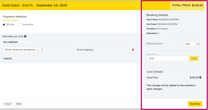 Step 2: From the booking pop-up, enter in all the correct details. For company, enter Studio by Tishman Speyer and enter yourself as Member. Confirm the rest of the details and then continue with the booking process. Make sure Payment Method is "Bill Later" in the next screen. Click "Book Now" to finalize.