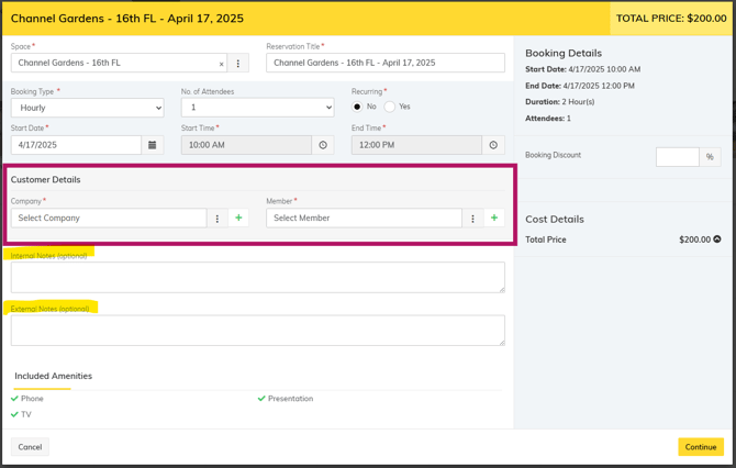 Select the Company and Member to attach to the booking. Both fields are required. If you do not know the member's name and you are creating a booking on their behalf, attach the primary member for the company.