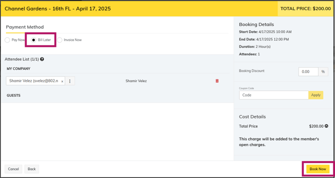 All members should be preset for Bill Later to have their booking charges added to the open charges and will appear on the following month's invoice.