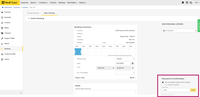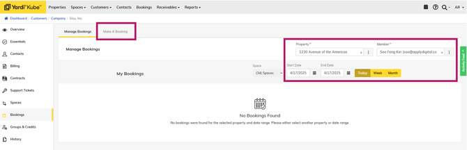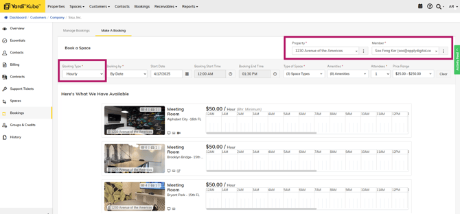 This article explains how onsite teams will create bookings for Member Companies in Yardi using the wholistic Bookings calendar in Yardi, as well as from a Company's page.