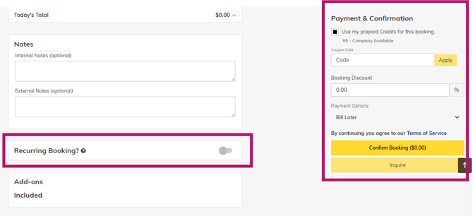 Note: If there are not enough credits to cover the cost of the booking, you will see the amount that will be added to Open Charges and invoiced on the next month's Bill Run.