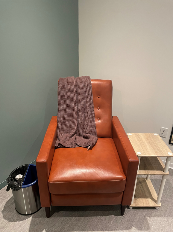 Step 4: Set up the chair. Materials Needed: Side Table, Blanket, Trashcan