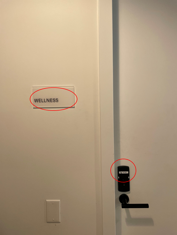Step 1: Ensure that there is proper signage outside of the door. Check the lock to be certain it locks and indicates occupancy.