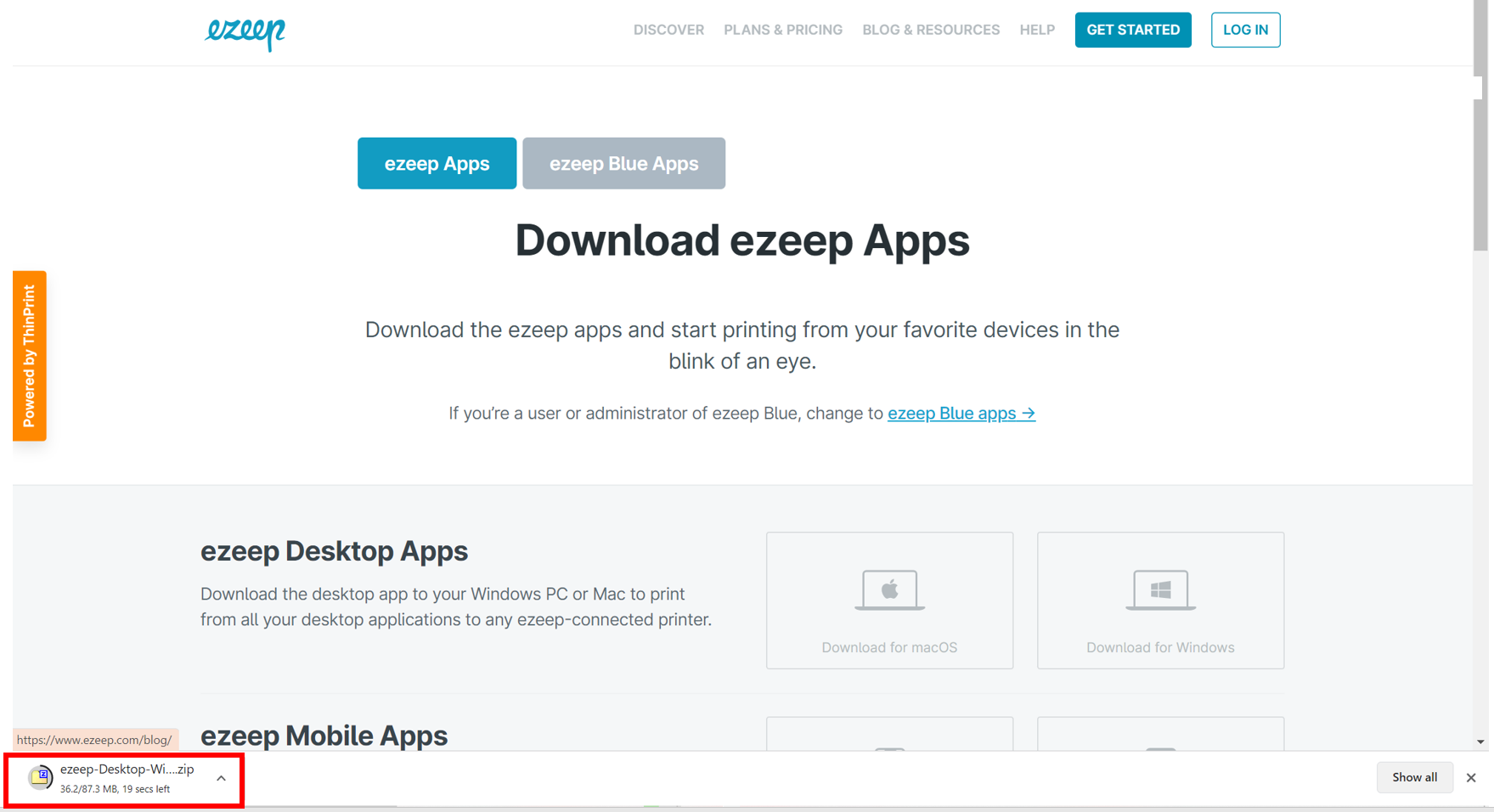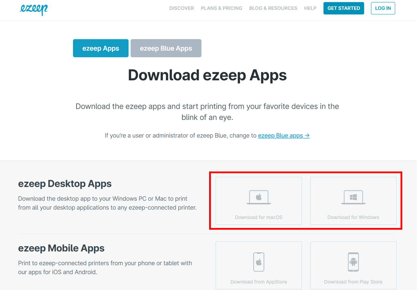 Step 1: Open up the Ezeep Downloads page. Under ezeep Desktop Apps, select the computer type the Member has.