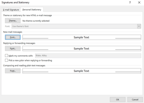 • In Outlook, select File > Options >  Mail > Stationary and Fonts…