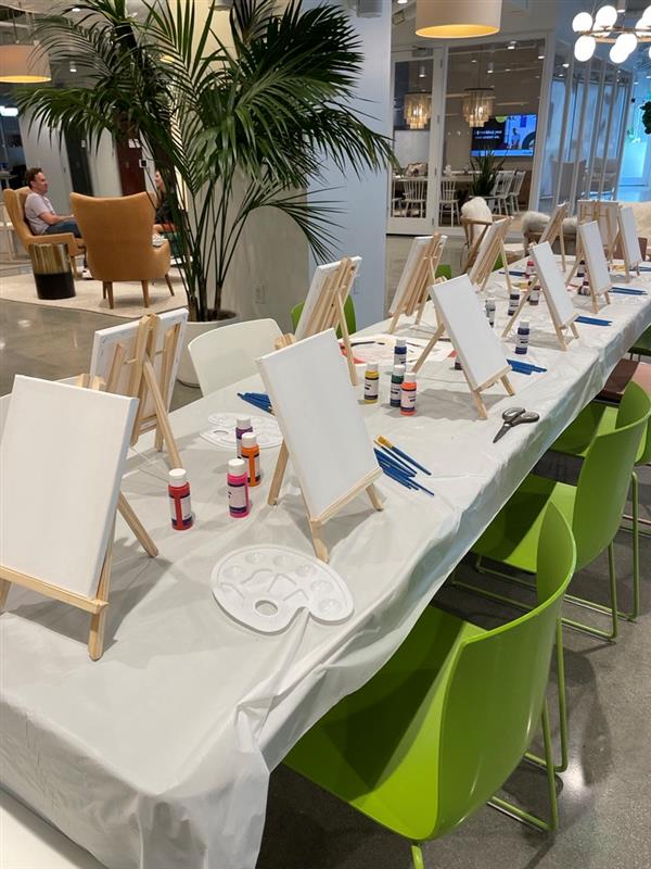 - Fill plastic cups with water and spread them out along the table so member can wash their brushes.