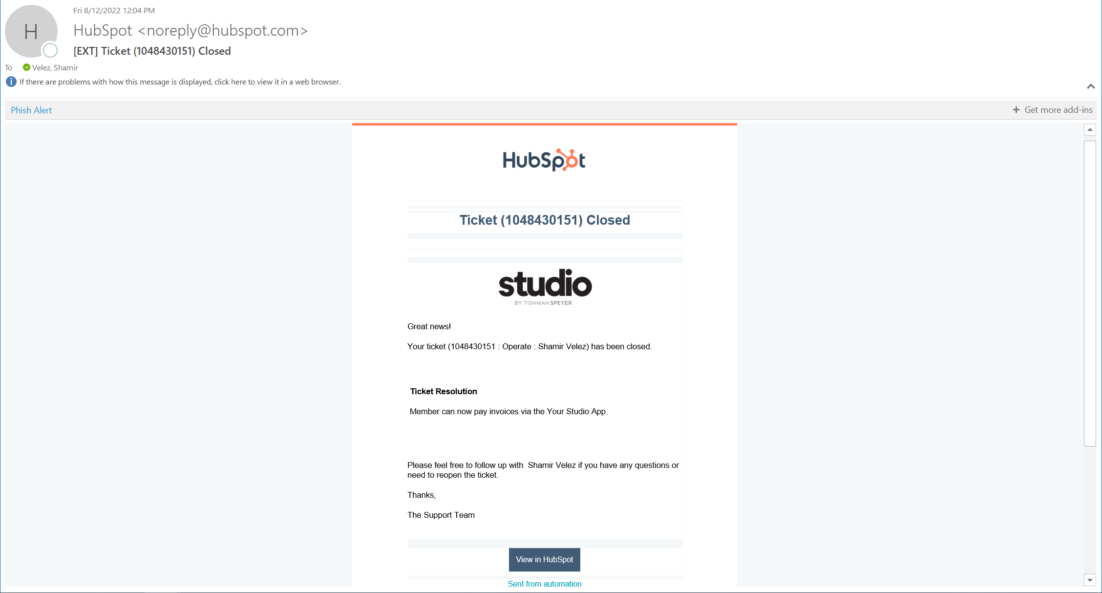 Step 4: The ticket will be closed and you will receive a confirmation email. If applicable, the email will contain a "Ticket Resolution" section, which you can pass along to the affected member.