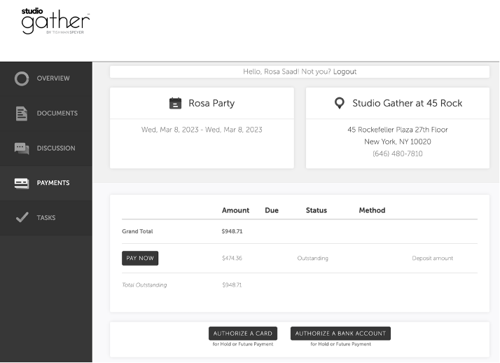 - Pay their 50% deposit in the Payments tab.