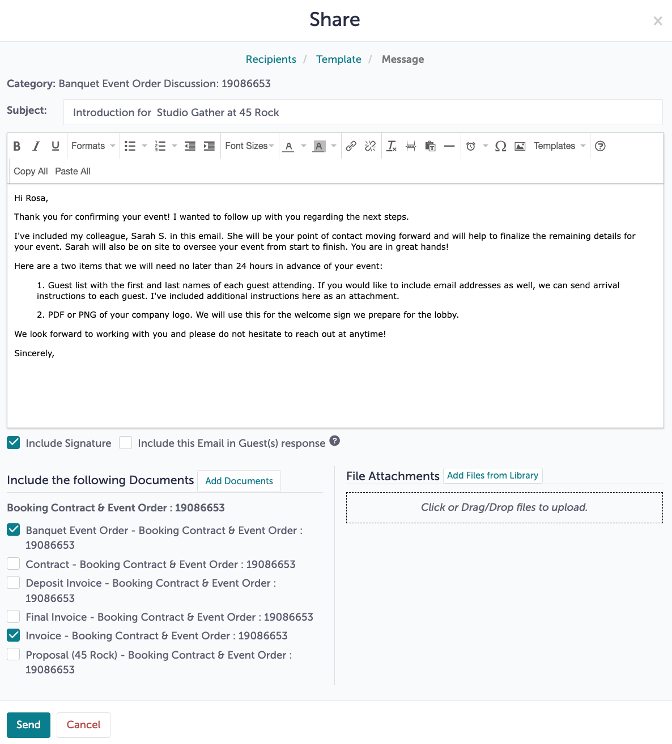 You will share the Proposal document with the client by clicking "Share" next to the document. Sharing a document with the client will activate the Guest Portal. This document will show up in the client’s Guest Portal, and they will also receive an email. Change the status of the event to "Tentative".