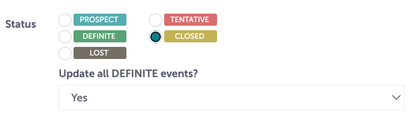 Once payment is complete, change the status of the event to “Closed”. Tripleseat will ask if you want to update all events; you should select "Yes".