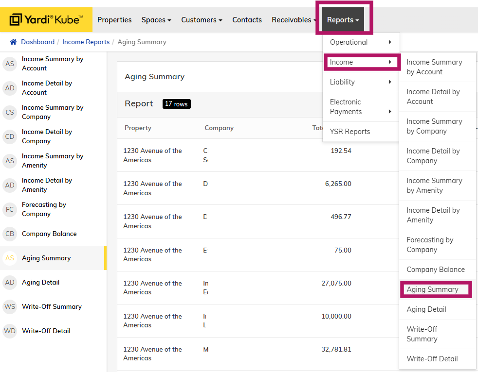 Step 1 - Log into Yardi Kube and navigate to Reports > Income > Aging Summary